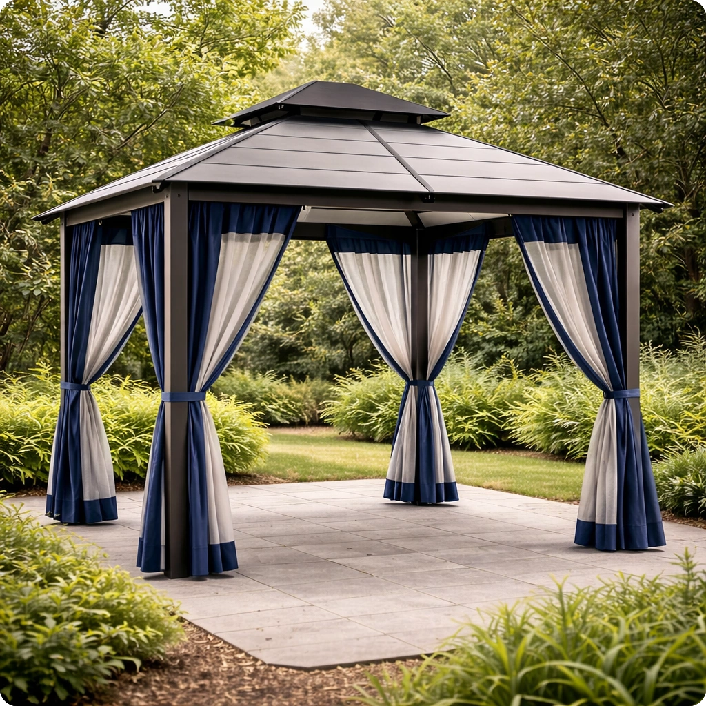 Pavillon en métal brun avec rideaux en polyester beige
